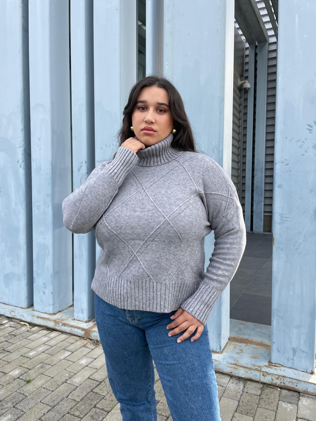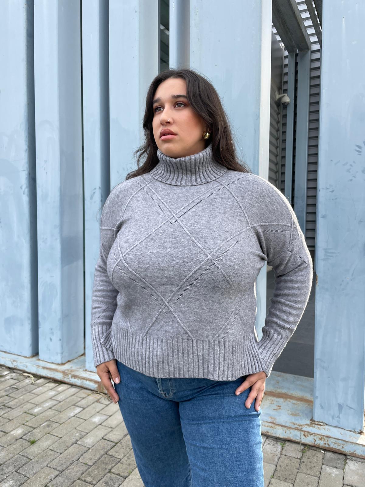Jersey gris cuello alto, talla única. Es de lana, estira y da talla hasta una L perfectamente.